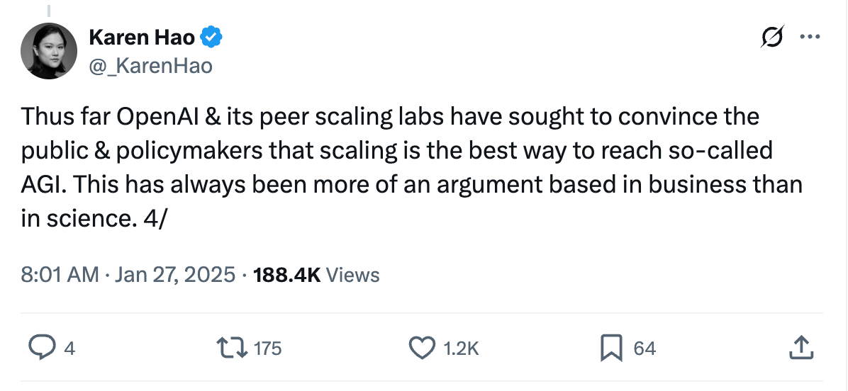 It would be obvious to anyone who read the DeepSeek paper and understood it that reality is the opposite of what’s implied above — DeepSeek R1’s launch proved that GPU horsepower is even more valuable than we had imagined. With the method described here, you can run tons and tons of GPU-intensive inferences and climb the ladder to AGI with nothing but electricity. The more GPUs and electricity you have on tap, the faster you can climb.