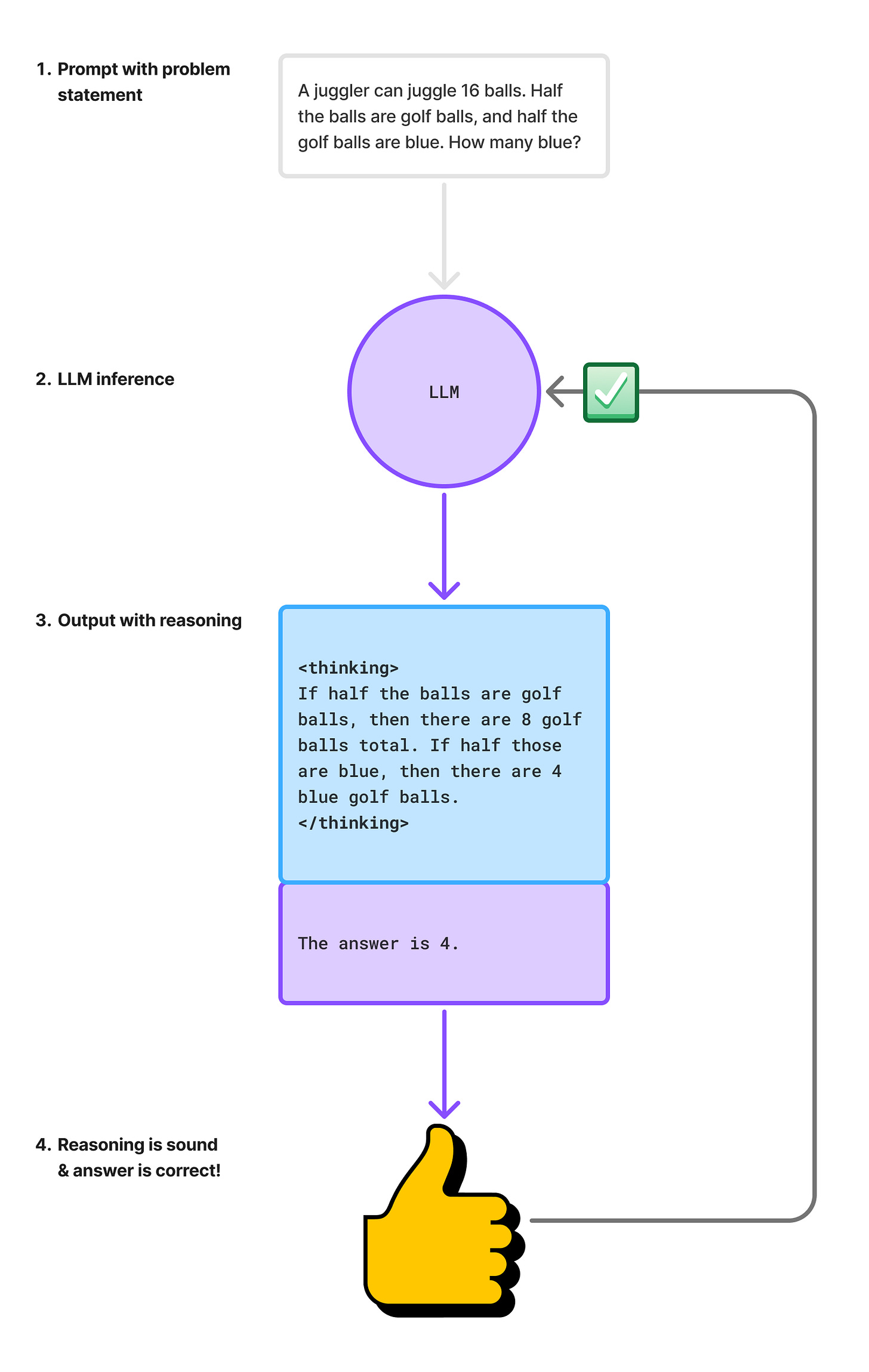 So that’s the “RL” in a nutshell, and you can probably guess from the above that we need some sort of fast, preferably automated way of providing the model with the appropriate 👍 or 👎 signals during training. But before we talk about that, let’s look at how we can use RL to teach models to do better reasoning.