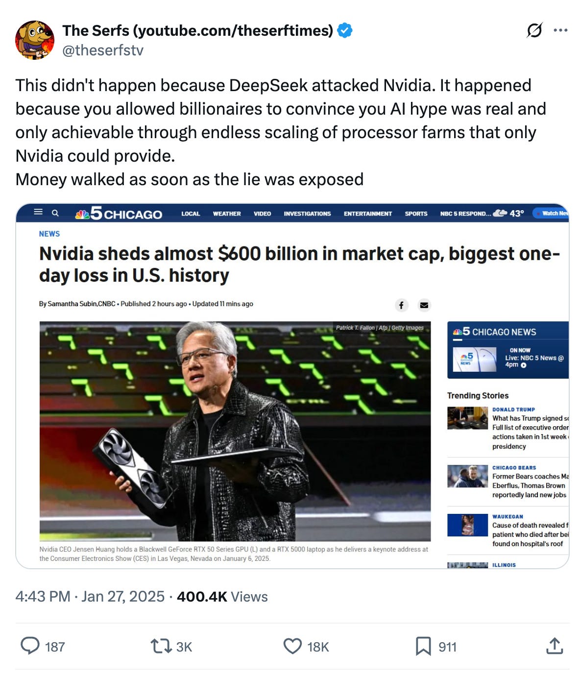If I’m right, then all of the above points are bearish for any company or country whose business is “AI” and whose moat is access to GPU cycles and data. Yes, I’m talking about NVIDIA, but also about the US, which is trying to retain an edge in AI via GPU export controls.