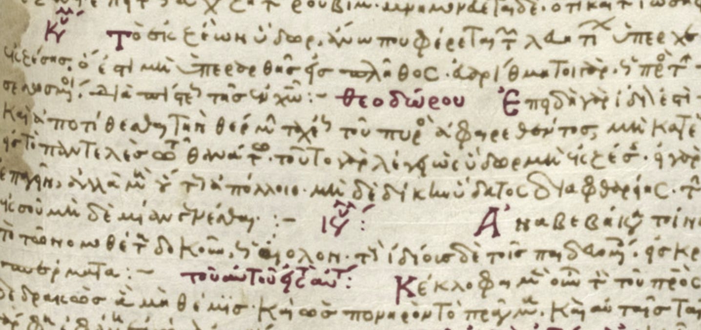 If you have some facility with Greek and think the above script is impossible to read, you’re right. I took a graduate seminar on Byzantine Greek paleography, and while the class was wonderful this particular script was a nightmare for all of us. I found the best approach to this was to just read it aloud, as it was meant to be read, and to listen for the word boundaries.