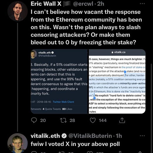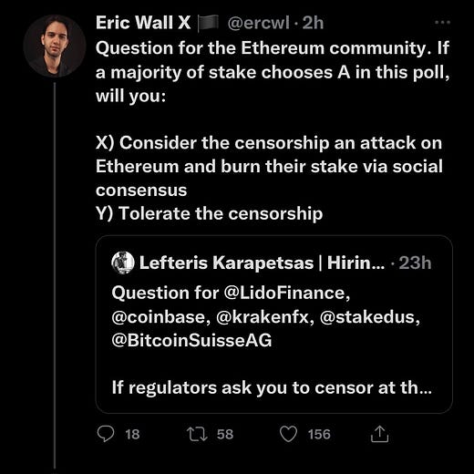 I’m going to refrain from speculating about how this could all shake out for Ethereum, and outsource such to my TL. The point of this post was to just flag for the crypto-adjacent how big of a crisis the community is facing right now, and how that crisis is related to the two main events everyone is talking about right now, i.e., the Tornado Cash sanctions and the PoS transition.