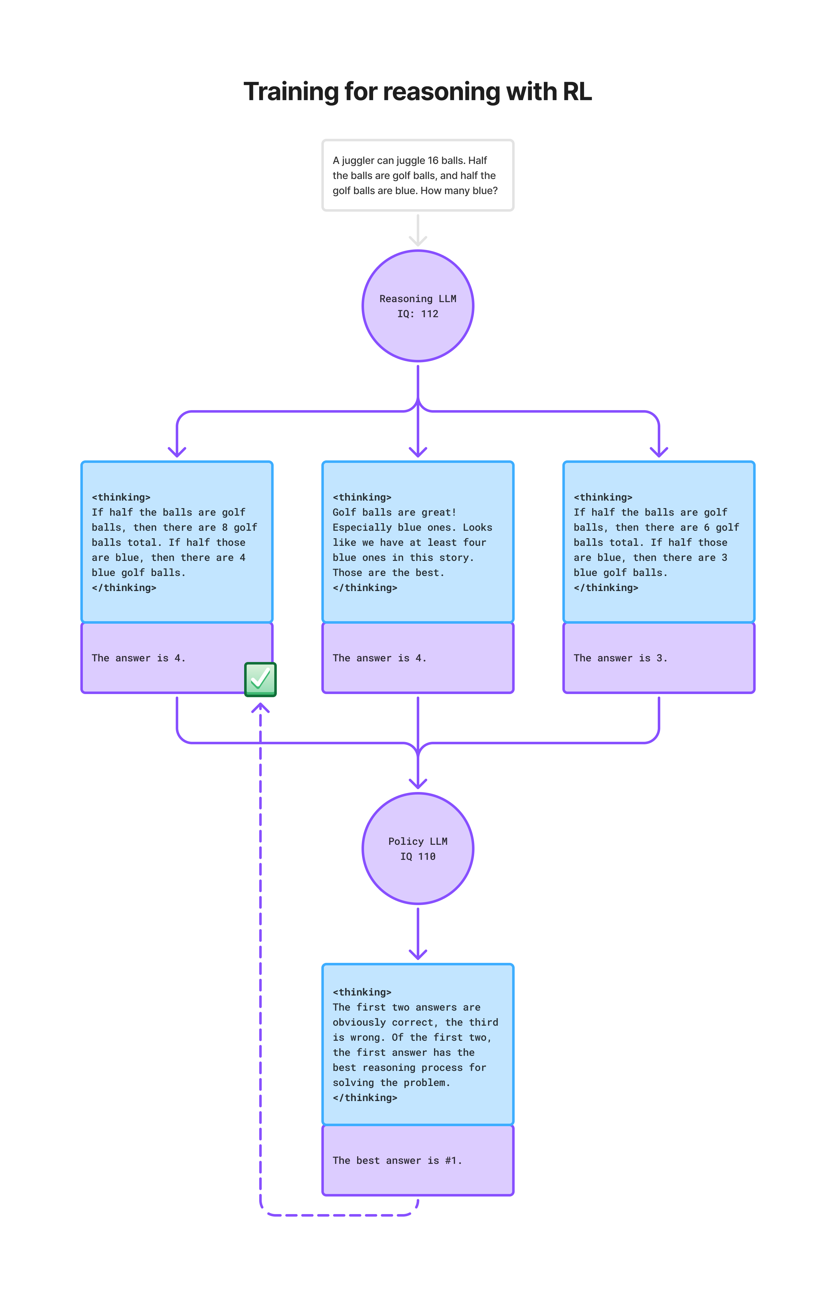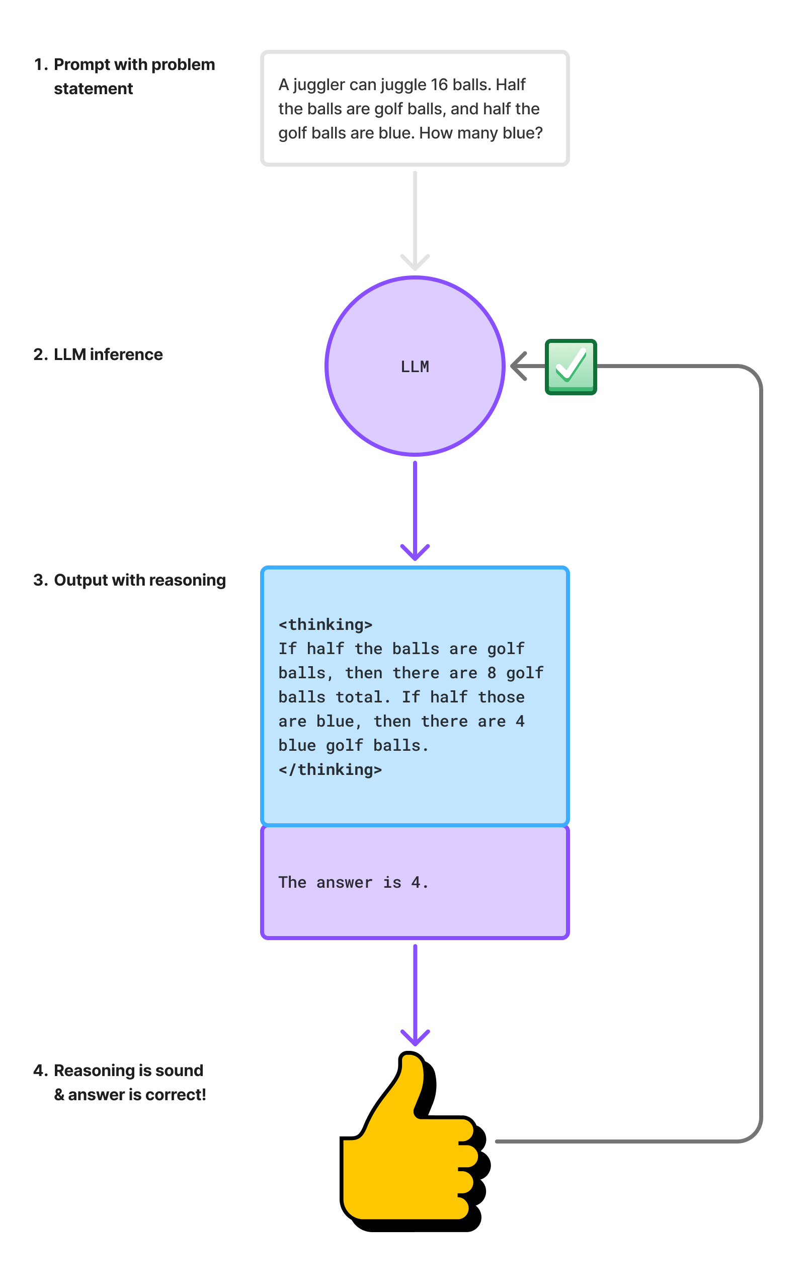 So that’s the “RL” in a nutshell, and you can probably guess from the above that we need some sort of fast, preferably automated way of providing the model with the appropriate 👍 or 👎 signals during training. But before we talk about that, let’s look at how we can use RL to teach models to do better reasoning.