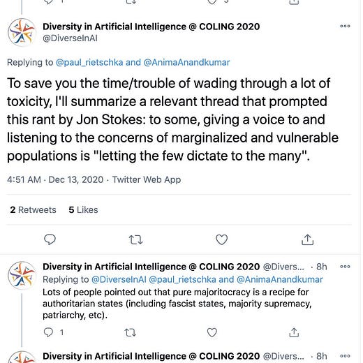 (🦜 I actually think the “Stochastic Parrots” paper was just bad, at least initial leaked draft of it was, and that’s why Google didn’t want it published. This is literally what they told the authors — it wasn’t up to the company’s quality bar. I heard on background from multiple other ML researchers that the parts on LLM energy use and environmental impact were weak in the first draft. I also think that even in the draft that was published, the supposed harms of LLMs are overhyped. If I were Google, I wouldn’t have wanted it to go out under my name, either. But in the popular lore around this document, Google tried to block it from getting published because they didn’t want their people warning the public about how dangerous LLMs are.)
